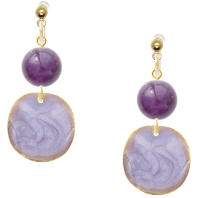 天然石のアメジストにウェーブ加工を施しラメ色をのせたメタルパーツを使用しました。メタルパーツは裏はゴールドようにみえ裏表でお楽しみいただけます。アメジストには高貴、心の平和、誠実の意味があります。